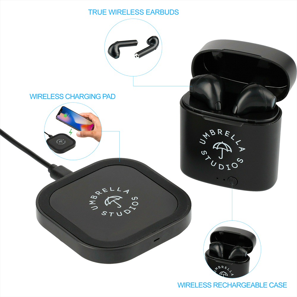 This set includes the Oros True Wireless Auto Pair Bluetooth Earbuds and a wireless charging pad. The Oros True Wireless Auto Pair Bluetooth Earbuds are the future of Bluetooth earbuds. There is no wire connecting the earbuds making them true wireless earbuds! The earbuds feature Bluetooth 5.0, Auto-Pairing, and Auto Power-On. Once the earbuds are removed from the case, they will power on and automatically sync to each other! The case also doubles as a power bank for your earbuds. While you’re listening to your favorite audio you can be using the wireless charging pad to charge your phone wirelessly. The case for the earbuds can also be wirelessly recharged with the included pad or with the provided micro USB cable. The earbud power case can charge your earbuds 2x from 0-100%. The playback time of the earbuds are 5 hours at max volume on a single charge. The earbuds have built in music controls and a microphone for hands free operation. Charge time: Earbuds 2hrs, Case: 2hrs. Note: Product is plain stock not printed as per images