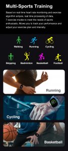 Distance, Calories, Time and date display, Heart rate monitoring, Sleep monitoring, Blood pressure measurement, Blood oxygen saturation measurement, Exercise mode, Timer, Call and message notifications, Camera control, Music control.