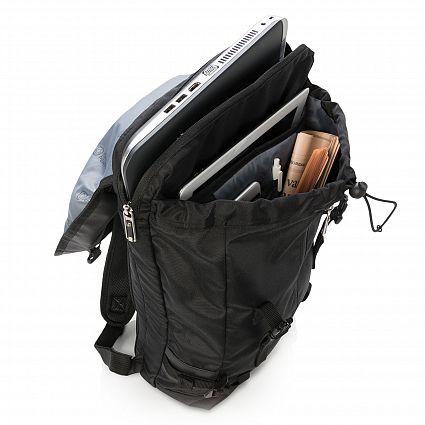 This smart laptop bag doesn’t rely on zips and has a flap-over closure which features two strong snap buckles that provide much easier access for a laptop and it is well protected by the heavy duty padding inside. It is manufactured from 600D polyester and has a drawstring front pocket with a vertical zip for added storage.
